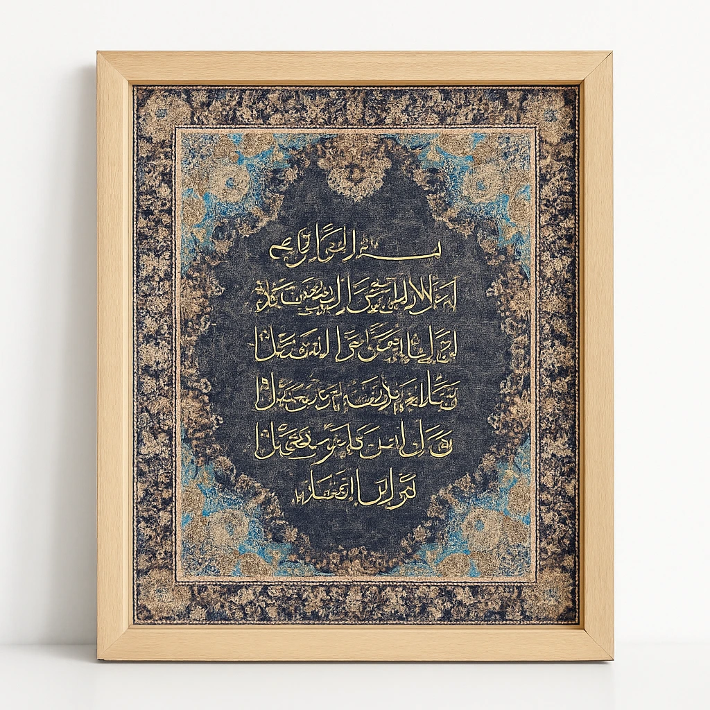 Crafted with meticulous detail, this masterpiece features handcrafted Arabic calligraphy surrounded by an ornate blue and gold floral pattern, making it a stunning focal point for any space. The premium wooden frame adds sophistication, while the vibrant colors and intricate design reflect Islamic heritage and artistry.